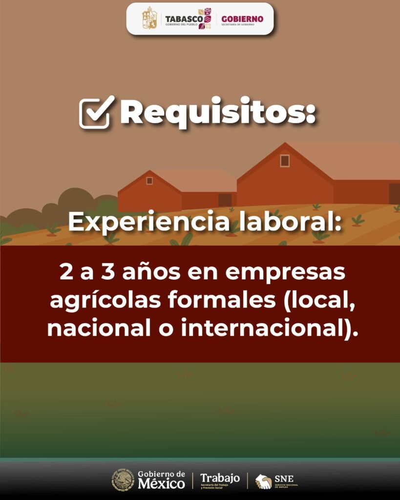 La empresa solicitante requiere que las personas interesadas cuenten con experiencia comprobable de entre dos y tres años en empresas agrícolas formales, ya sea a nivel local, nacional o internacional. Dicha experiencia deberá acreditarse mediante cartas laborales, recibos de nómina o visas de trabajo emitidas por empleadores agrícolas.