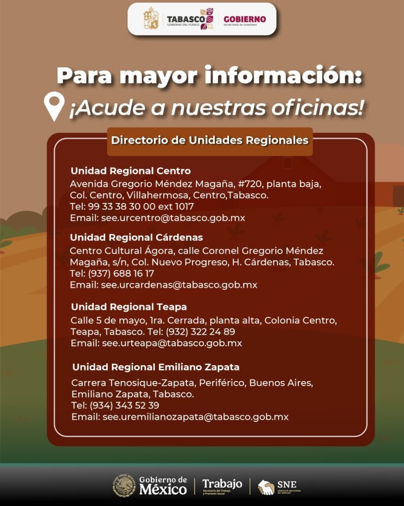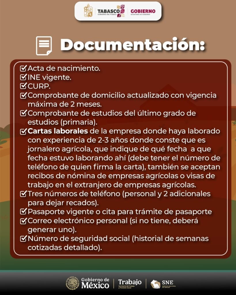 Entre los documentos solicitados se encuentran identificación oficial vigente, acta de nacimiento, CURP, comprobante de domicilio reciente, pasaporte vigente o cita para su trámite, número de seguridad social y datos de contacto. Las personas interesadas pueden acudir a las oficinas del Servicio Nacional de Empleo en Villahermosa o comunicarse vía telefónica. El SEE reiteró su compromiso con la promoción de empleos dignos que impulsen el bienestar y el desarrollo económico de Tabasco.