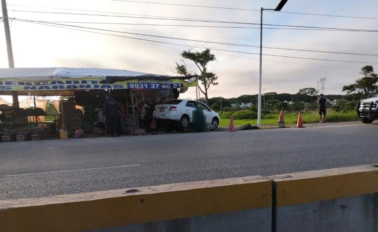 Accidente en Villahermosa-Nacajuca deja daños materiales tras impacto contra puesto de frutas.