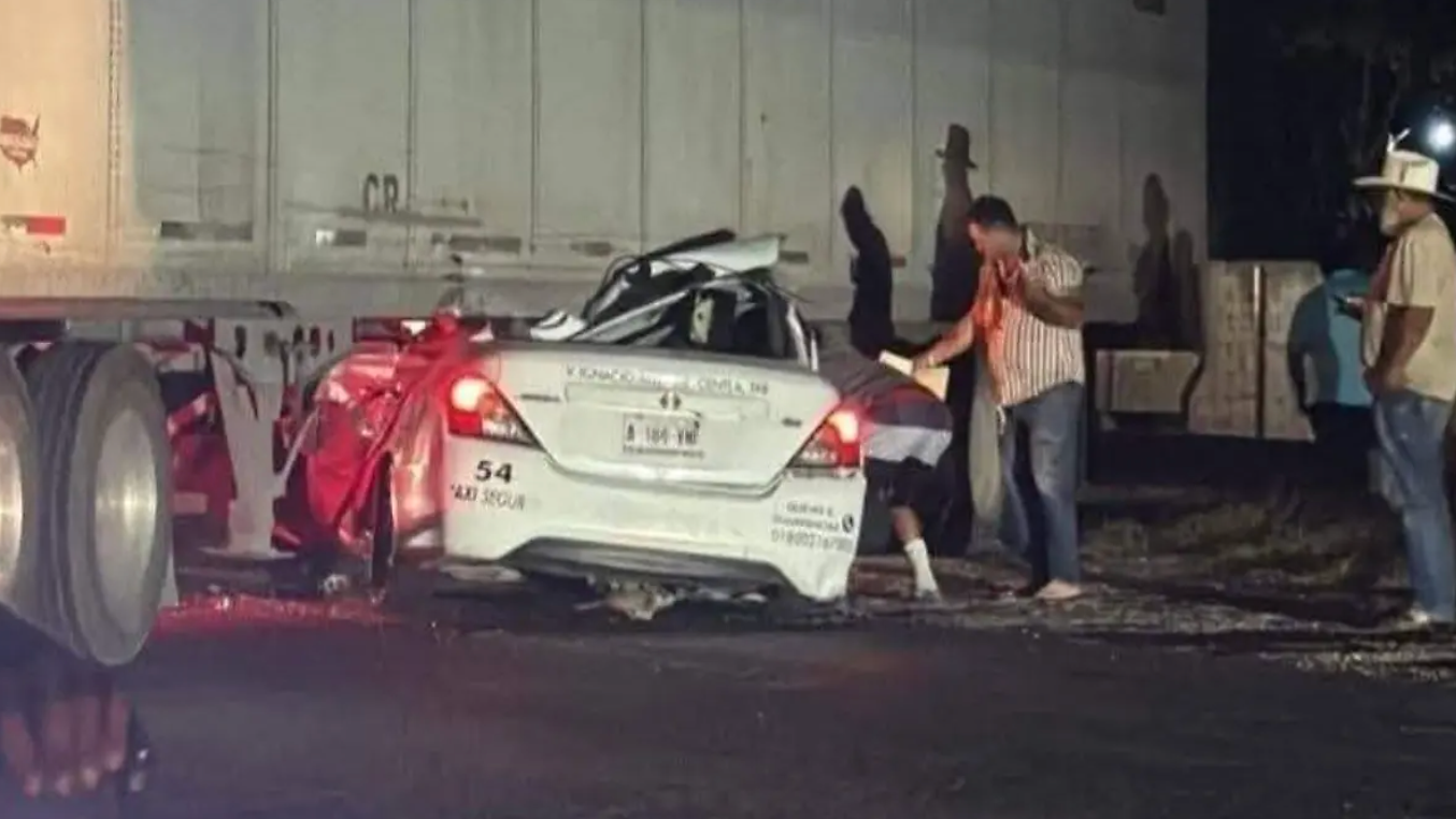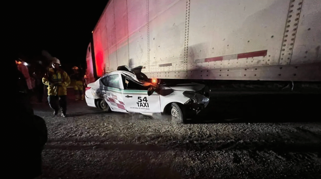 Tras la maniobra, el taxi blanco terminó parcialmente incrustado bajo la caja del tráiler, lo que generó una intensa movilización de cuerpos de emergencia y rescatistas en la zona.