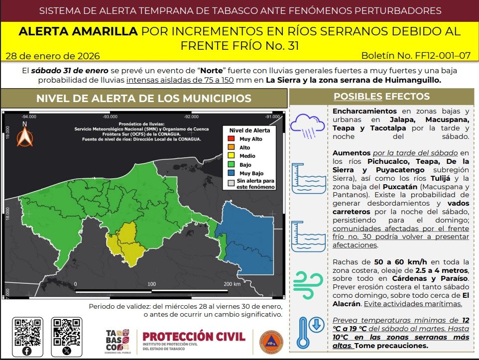 El Instituto de Protección Civil del Estado de Tabasco emitió Alerta Amarilla ante el posible ingreso del Frente Frío número 31, previsto principalmente para el sábado 31 de enero, debido a la probabilidad de condiciones meteorológicas adversas en gran parte del estado. El pronóstico indica lluvias generales fuertes a muy fuertes, con acumulados intensos de 75 a 150 milímetros en la región de La Sierra y la zona serrana de Huimanguillo, además de un evento de Norte con rachas de viento significativas.