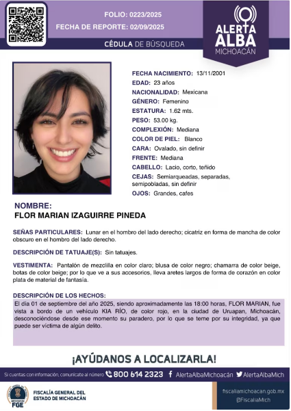 Marian Izaguirre Pineda, creadora de contenido con 3.9 millones de seguidores en TikTok y 320 mil en Instagram, fue reportada desaparecida en Uruapan, Michoacán, el pasado 1 de septiembre. La joven de 23 años viajaba a bordo de un vehículo rojo Kia Río cuando se le perdió el rastro. La Fiscalía General del Estado emitió la #AlertaAlba para dar con su paradero, señalando que se teme por su integridad. Marian es de complexión mediana, cabello lacio corto y tiene un lunar en el hombro derecho y una cicatriz. Su desaparición se suma a otros casos recientes de mujeres desaparecidas en la región. Amigos, colegas y seguidores han compartido la ficha de búsqueda en redes sociales con la esperanza de localizarla con vida. Las autoridades continúan las investigaciones para esclarecer su paradero.
