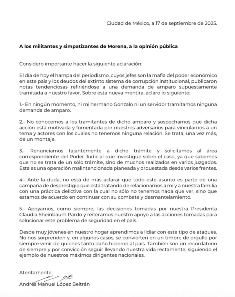 Andrés “Andy” López Beltrán, hijo de AMLO y secretario de Organización de Morena, desmintió públicamente que él o su hermano Gonzalo “Bobby” hayan tramitado un amparo supuestamente relacionado con órdenes de captura. En un comunicado, señaló que la información difundida es un montaje orquestado por adversarios políticos y medios con intereses de desprestigio. Andy enfatizó que no conoce a los tramitantes del amparo registrado en el Órgano de Administración Judicial y solicitó que se investigue el caso. Aseguró que esta situación forma parte de una campaña de difamación y reiteró su apoyo a la lucha contra delitos como el huachicol, desligando a su familia de cualquier relación con prácticas delictivas.