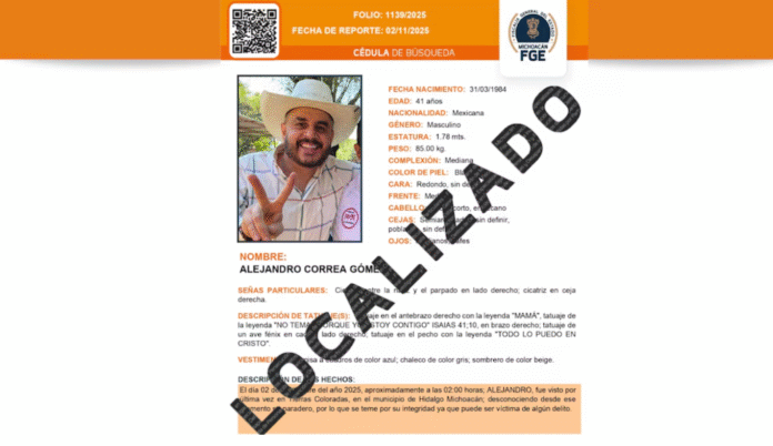 La Fiscalía General del Estado de Michoacán confirmó que Alejandro Correa Gómez, exalcalde de Zinapécuaro, fue localizado con vida tras cinco días de intensa búsqueda.