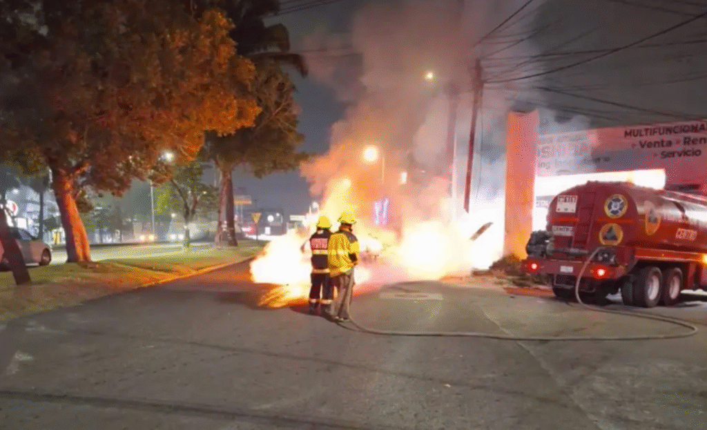 De acuerdo con reportes preliminares, el conductor de un automóvil compacto circulaba a exceso de velocidad cuando perdió el control del vehículo, atropellando a un peatón. Posteriormente, la unidad se impactó contra un poste de servicio público y comenzó a incendiarse, quedando en pérdida total.