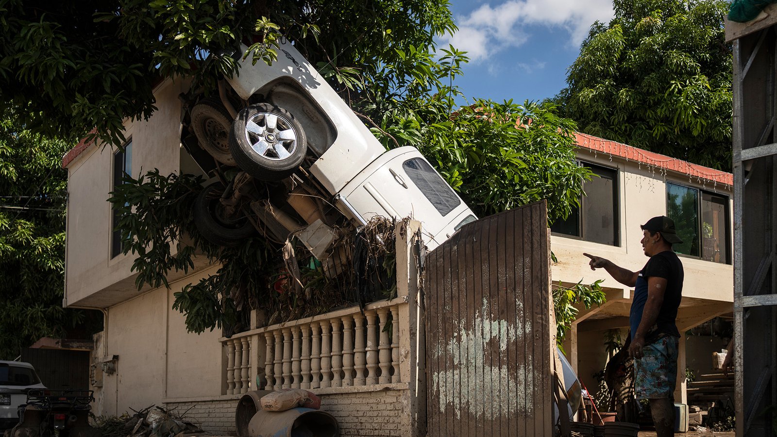 Una camioneta sobre la cerca de una residencia después de intensas lluvias e inundaciones, el domingo 12 de octubre de 2025, en Poza Rica, Veracruz, México. (AP Foto/Félix Márquez)
