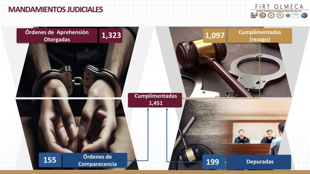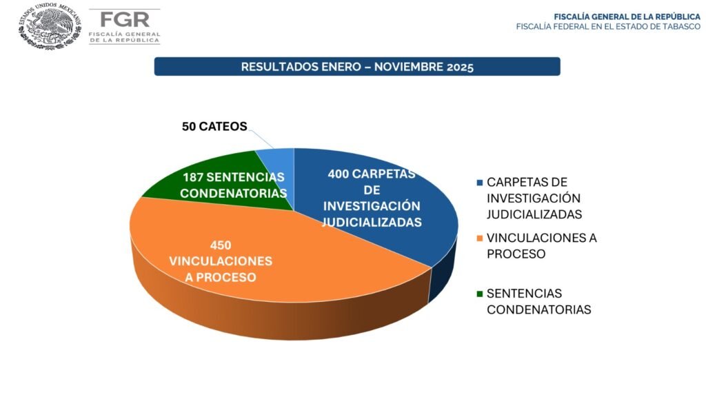 Por su parte, la FGR reportó cifras sin precedentes: 187 sentencias condenatorias, 400 carpetas judicializadas, 450 vinculaciones a proceso y 50 cateos relacionados con hidrocarburos. También se logró la recuperación de más de 12 millones de pesos mediante salidas alternas y la capacitación de 1,583 primeros respondientes, además de acciones preventivas en beneficio de 17 mil estudiantes.