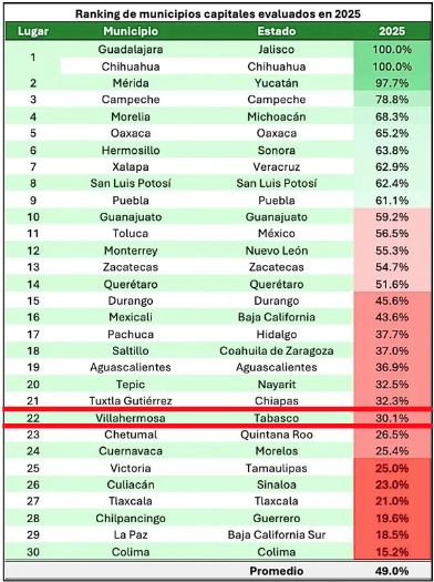 El municipio de Centro, gobernado por Yolanda Osuna Huerta, enfrenta una severa crisis en materia de transparencia y rendición de cuentas, según los resultados más recientes presentados por el colectivo Ciudadanos por Municipios Transparentes (CIMTRA). Esta evaluación abarcó a 30 capitales del país, incluyendo Villahermosa, sede del Ayuntamiento de Centro, y reveló que esta administración se ubica en el lugar 22 a nivel nacional, con apenas 30 puntos de 100 posibles, mostrando un desempeño deficiente en la apertura de información a la ciudadanía sin necesidad de solicitudes formales.