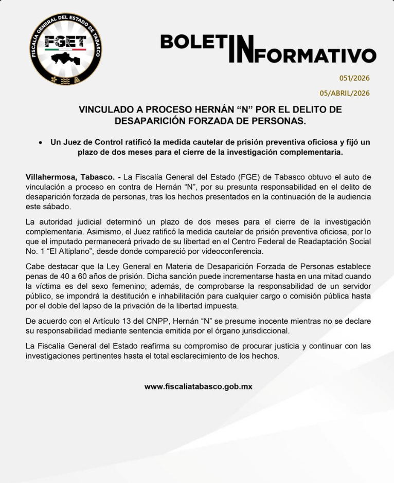 La Fiscalía General del Estado informó que Hernán Bermúdez Requena, exsecretario de Seguridad y Protección Ciudadana, fue vinculado a proceso por desaparición forzada de personas. De acuerdo con la autoridad, el imputado podría enfrentar penas de 40 a 60 años de prisión, mismas que pueden incrementarse cuando las víctimas son mujeres o si se acredita su calidad de servidor público.