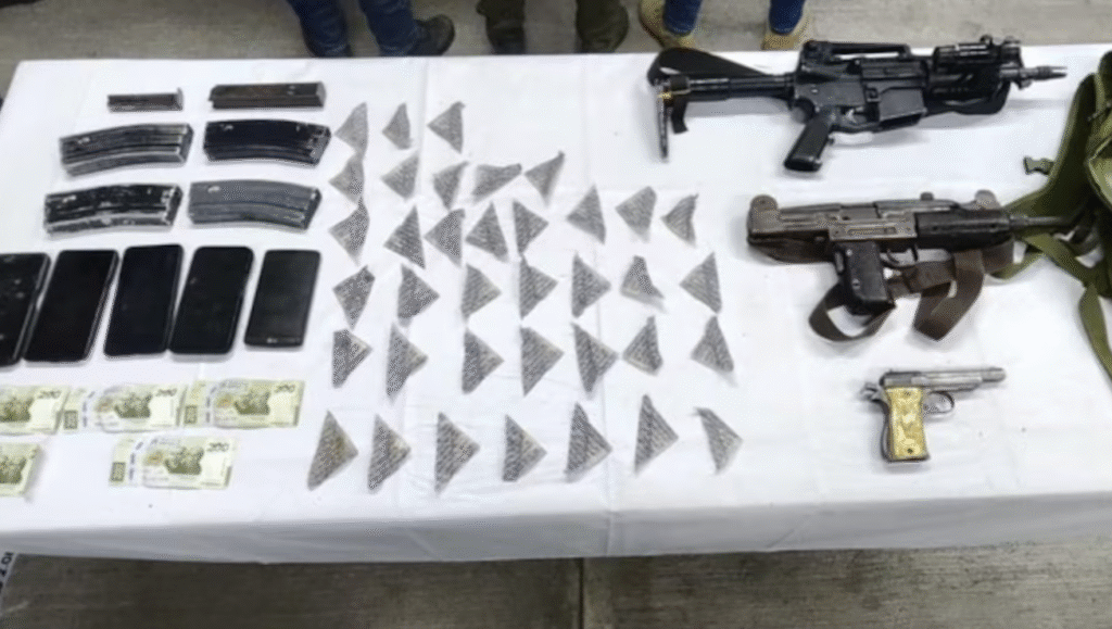 Entre los objetos asegurados se encuentran un rifle AR-15 con cargadores abastecidos, un subfusil tipo Uzi, un arma corta calibre .22, además de 37 dosis de presunto cristal, teléfonos celulares, dinero en efectivo y una mochila.