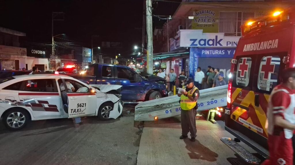La noche de este jueves se registró un fuerte accidente vehicular en la avenida Gregorio Méndez Magaña, en la colonia Tamulté de las Barrancas, en Villahermosa. En el percance participaron un taxi con número económico 5621 y una camioneta particular color azul, generando movilización de cuerpos de emergencia.
