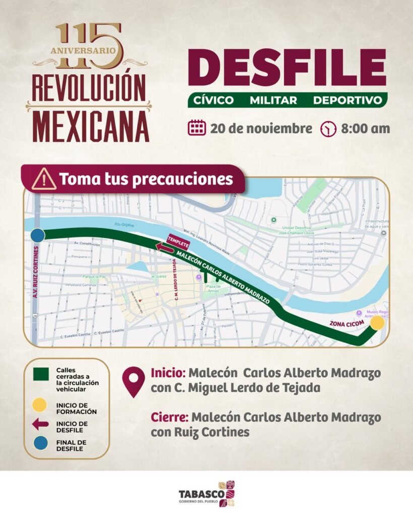 El desfile iniciará en la calle Miguel Lerdo de Tejada, avanzará sobre el malecón Carlos Alberto Madrazo Becerra y concluirá en el cruce con la avenida Ruiz Cortines. Por ello, estas vías permanecerán cerradas desde las 7:00 a.m. La SSPC pidió a la ciudadanía tomar previsiones, considerar rutas alternas, salir con tiempo y conducir con responsabilidad para garantizar un evento seguro y sin contratiempos. El objetivo es asegurar orden, movilidad y protección durante toda la jornada.