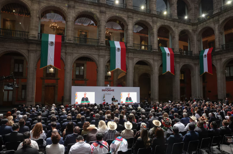 Claudia Sheinbaum presentó su Primer Informe de Gobierno en Palacio Nacional, resaltando que México vive “los niveles más bajos de pobreza en 40 años”. La presidenta destacó la construcción de 31 hospitales en 2025, la proyección de 390 mil viviendas y el aumento del 12% al salario mínimo. También subrayó nuevos programas sociales como la Pensión Mujeres Bienestar y becas Rita Cetina, además de apoyos directos por más de 12 mil millones a comunidades indígenas y afromexicanas. En materia económica, señaló un crecimiento anual de 1.2%, récord de inversión extranjera y baja inflación. En seguridad, aseguró que la disminución de homicidios continuará con el nuevo Poder Judicial. Además, destacó la innovación tecnológica con proyectos de movilidad, satélites y semiconductores. Finalmente, reiteró que su gobierno se guía por resultados, no promesas, y que mantendrá la relación sólida con Estados Unidos en respeto mutuo.