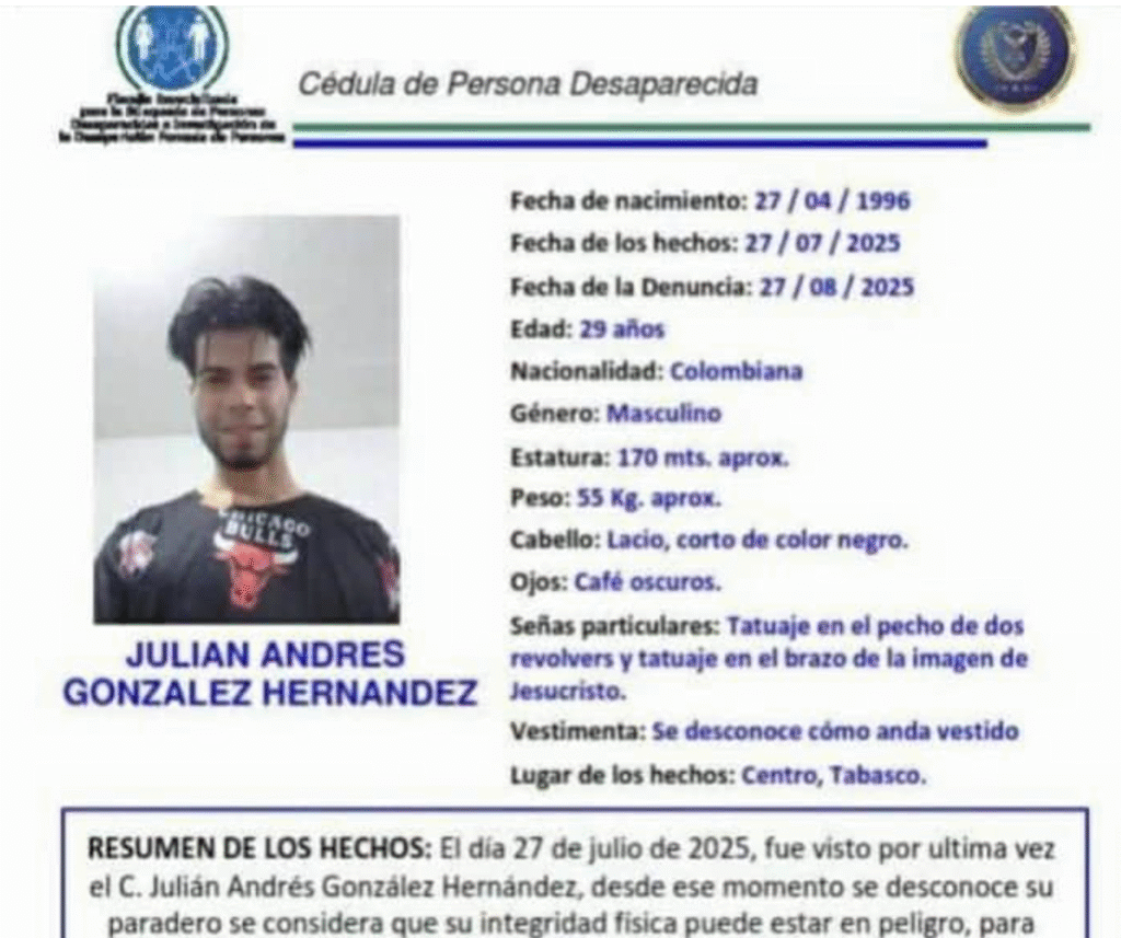 Julián Andrés González Hernández, de 29 años y originario de Colombia, desapareció en el estado de Tabasco luego de emprender su viaje rumbo a Estados Unidos en busca de mejores oportunidades de vida. Su travesía inició el 2 de febrero de 2024, cruzando Centroamérica y la selva del Darién hasta llegar a México, donde enfrentó condiciones de vulnerabilidad por no contar con documentos.