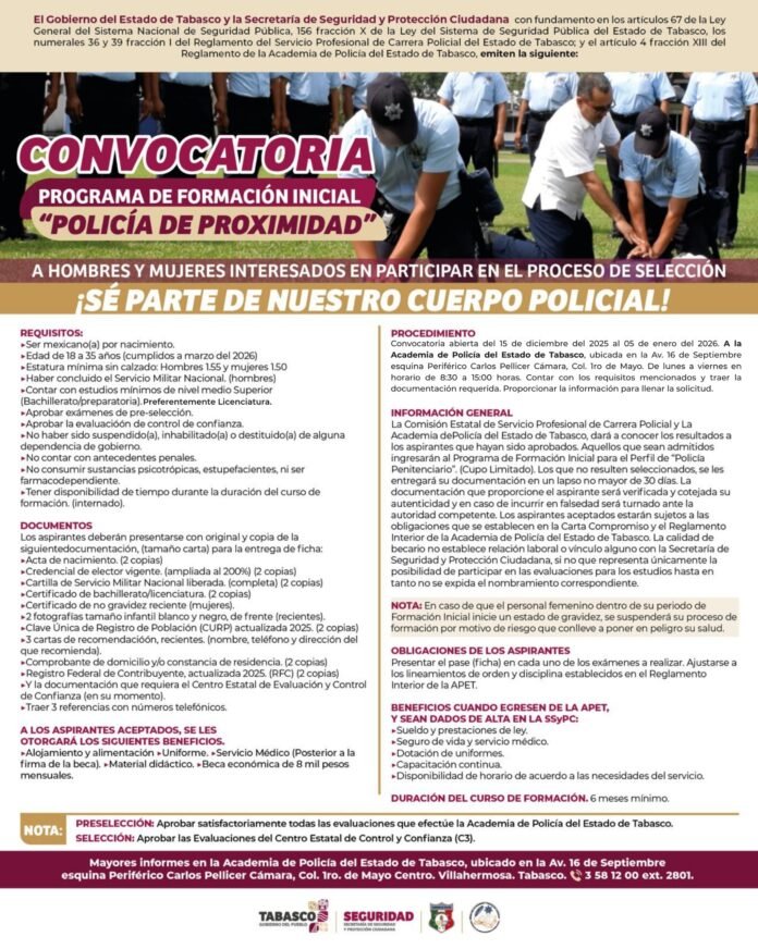 La Secretaría de Seguridad y Protección Ciudadana de Tabasco invita a todas las personas interesadas a participar en el programa de formación inicial para las vacantes de Policía de Proximidad y Policía Penitenciaria. Esta convocatoria estará abierta del 15 de diciembre de 2025 al 5 de enero de 2026. Es una oportunidad única para formar parte de un equipo comprometido con la seguridad y la protección de nuestra comunidad, desarrollando las habilidades y conocimientos necesarios para un servicio profesional y cercano a la ciudadanía. ¡Únete y contribuye a construir un Tabasco más seguro! dame un titulo.