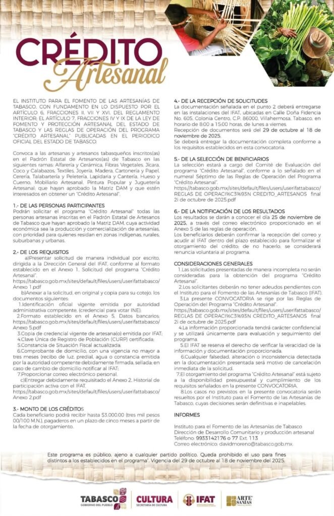 Las bases completas pueden consultarse en las redes sociales oficiales y en el portal del Gobierno del Estado de Tabasco: https://tabasco.gob.mx/credito-artesanal.