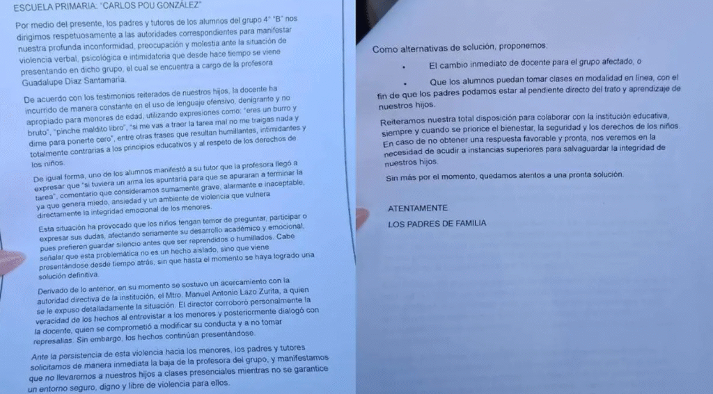 Ante la falta de cambios, los padres se manifestaron, entregaron escritos formales y exigieron la destitución inmediata de la docente. Tras reuniones con personal de la Secretaría de Educación, se firmó una minuta donde se acordó retirarla del grupo, impedir cualquier contacto con estudiantes y designar a una maestra temporal para concluir el ciclo escolar.