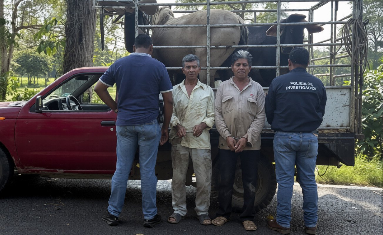 La Unidad Estatal de Combate al Abigeato informó la detención en flagrancia de dos adultos mayores por el presunto delito de abigeato equiparado, en hechos ocurridos en el municipio de Nacajuca. Los sujetos fueron interceptados mientras transportaban dos bovinos y un equino a bordo de una camioneta Nissan, sin poder acreditar la legal procedencia de los animales.