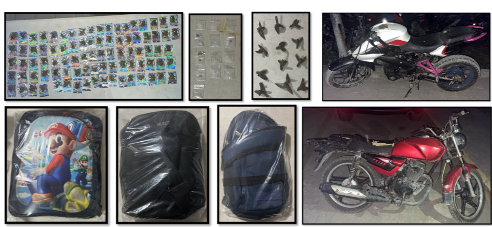 En la revisión se localizó hierba seca verde y una sustancia granulada con características similares al cristal, así como 12 ponchallantas, dos mariconeras y una mochila. También se decomisaron dos motocicletas, una de ellas con reporte de robo.
