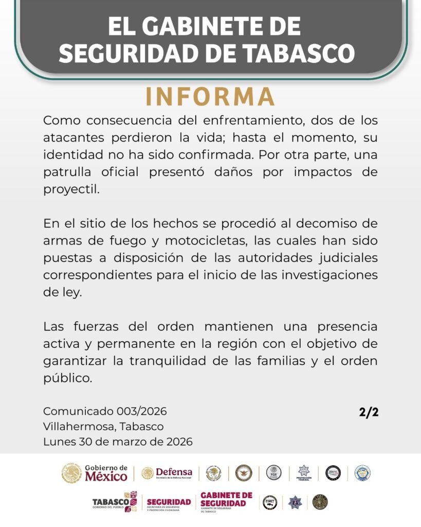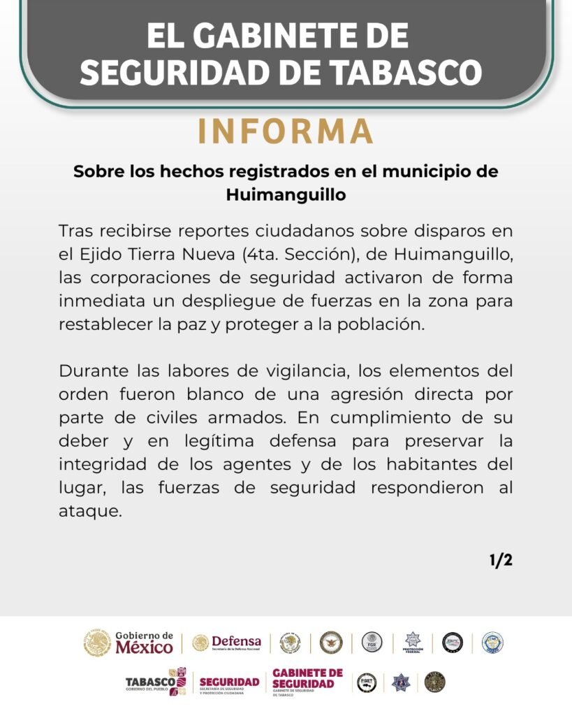 En la ranchería Tierra Nueva, en Huimanguillo, dos civiles armados fueron abatidos luego de emboscar a elementos de seguridad durante la madrugada. Los agentes repelieron la agresión en legítima defensa, logrando contener el ataque. En el lugar se aseguraron armas de fuego y motocicletas, además de registrarse daños por impactos de bala en una patrulla oficial.