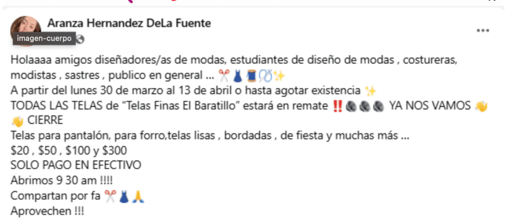 Durante este periodo, los clientes podrán adquirir telas para diferentes usos, como pantalón, forro, bordadas y de fiesta, con precios que van desde los 20 hasta los 300 pesos. Se precisó que las compras se realizarán únicamente en efectivo.
