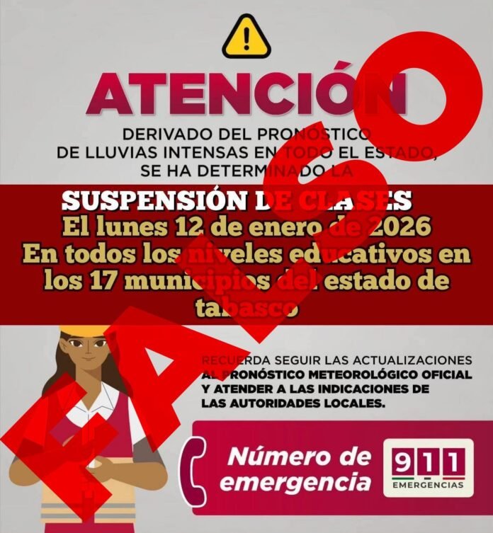 Es FALSA la imagen que circula en #RedesSociales y grupos de mensajería en la que indica una supuesta suspensión de clases en #Tabasco Se exhorta a la población a no hacer caso ni compartir información falsa; por lo que se pide estar atentos a los comunicados emitidos mediante vías oficiales.