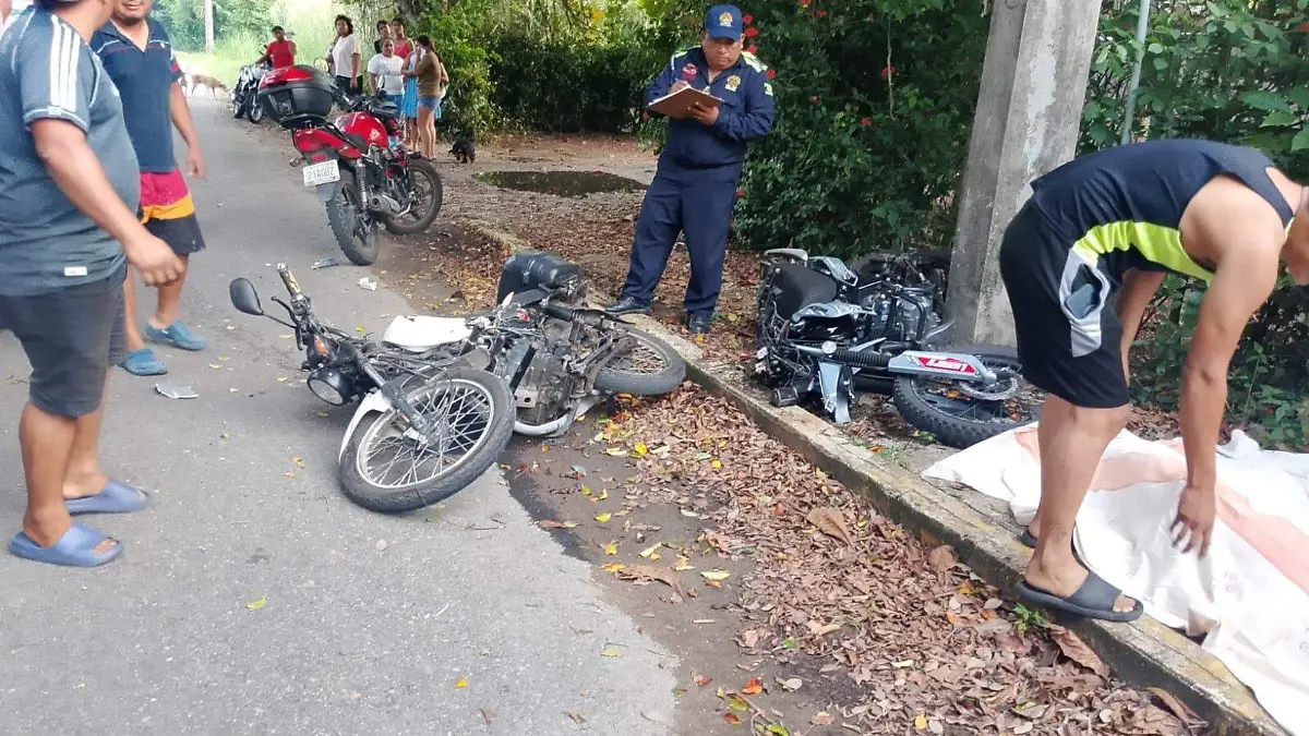 Un joven perdió la vida y otro resultó gravemente herido en un accidente entre motocicletas registrado el sábado 4 de octubre, cerca del CETMAR 19 en Frontera, Centla. Ambos viajaban en motocicletas color negro; el fallecido, identificado como Mario, llevaba casco y guantes de protección, mientras que el otro conductor no portaba equipo de seguridad. Mario quedó tendido sobre la banqueta con heridas graves en la cabeza. El conductor sobreviviente fue trasladado al hospital regional Ulises García en estado crítico. Autoridades municipales y de la Fiscalía General del Estado acudieron para atender el percance, levantar el cadáver y trasladarlo al Semefo, mientras se investigan las causas del choque.