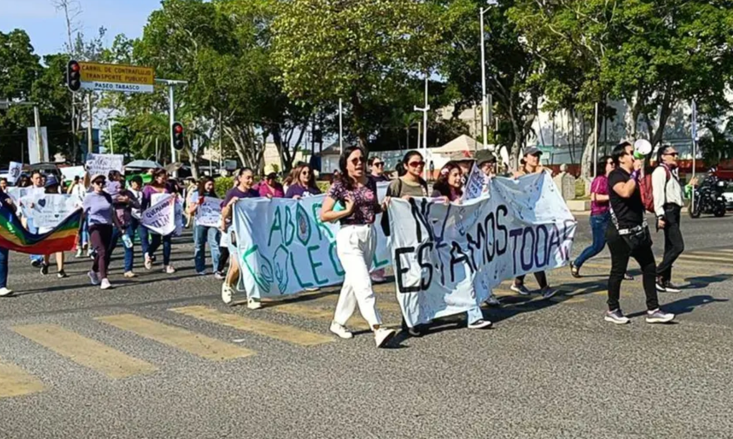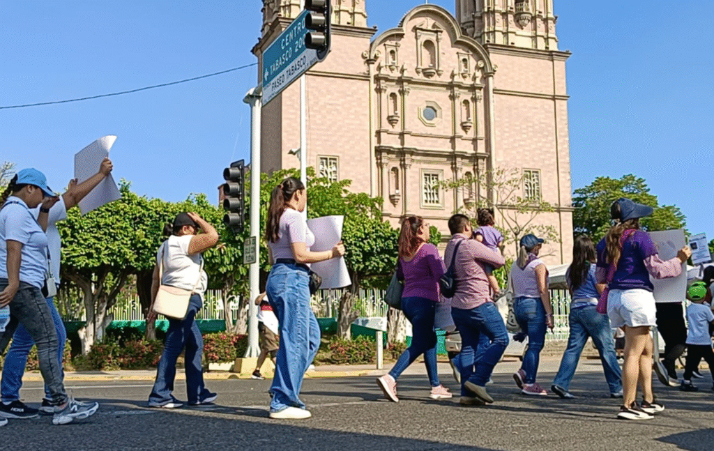 Durante el recorrido, el contingente se detuvo frente al Tribunal Superior de Justicia de Tabasco, donde reclamaron que la colocación de globos morados no sustituye la necesidad de justicia, coreando la consigna: “No quiero globos, quiero justicia”.