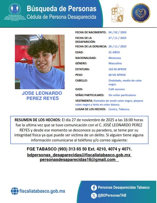 La Fiscalía General del Estado de Tabasco mantiene activa la cédula de búsqueda para localizar a José Leonardo Pérez Reyes, joven de 22 años desaparecido desde el 27 de noviembre en el municipio de Centro. Según el reporte oficial, se perdió contacto con él alrededor de las 16:00 horas.