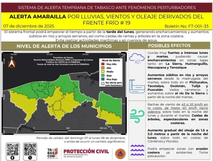 El Frente Frío No. 19 ocasionará condiciones climáticas adversas en Tabasco a partir del lunes, con lluvias fuertes a muy fuertes, acompañadas de rachas de viento e incremento gradual del oleaje. Las zonas bajas de La Sierra, Huimanguillo, Macuspana y Tenosique podrían registrar acumulaciones importantes, generando encharcamientos.