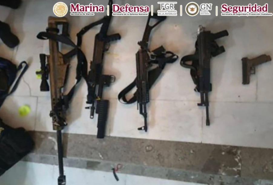 Durante la intervención, autoridades lograron asegurar un importante arsenal considerado de alto riesgo, entre el que destaca un fusil Barrett de uso militar, además de granadas, diversas dosis de droga, equipo táctico y un vehículo presuntamente utilizado en actividades ilícitas.