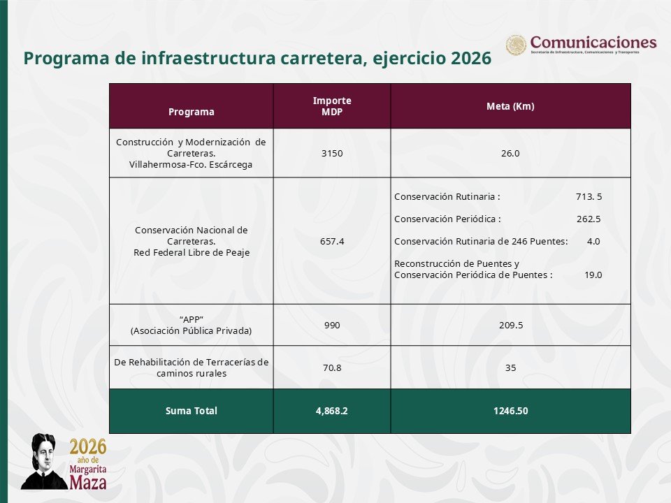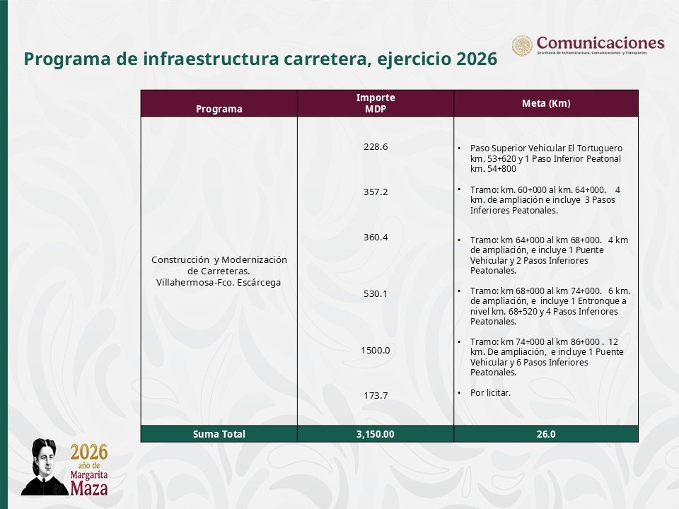 El titular del Centro SICT en Tabasco, Daniel Ochoa Leyva, informó que el programa federal contempla una inversión superior a los 3 mil 150 millones de pesos en infraestructura carretera. Entre las obras más relevantes se encuentra la modernización del tramo Macuspana–Escárcega, donde se ampliarán diversos subtramos y se construirán nuevas estructuras como el paso superior vehicular El Tortuguero.