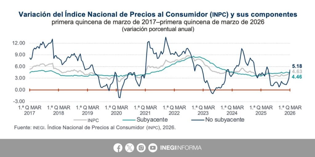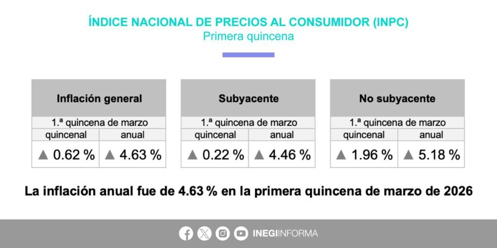 La inflación en México registró un repunte durante la primera quincena de marzo de 2026, al ubicarse en 4.63 por ciento anual, de acuerdo con datos del Instituto Nacional de Estadística y Geografía (Inegi). El Índice Nacional de Precios al Consumidor mostró un incremento de 0.62 por ciento respecto a la quincena anterior, evidenciando una aceleración en el ritmo de crecimiento de los precios.