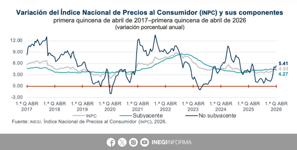 La inflación anual en México se ubicó en 4.53% durante la primera quincena de abril de 2026, de acuerdo con el INEGI. El Índice Nacional de Precios al Consumidor registró un incremento quincenal de 0.11%, impulsado principalmente por el alza en productos agrícolas.