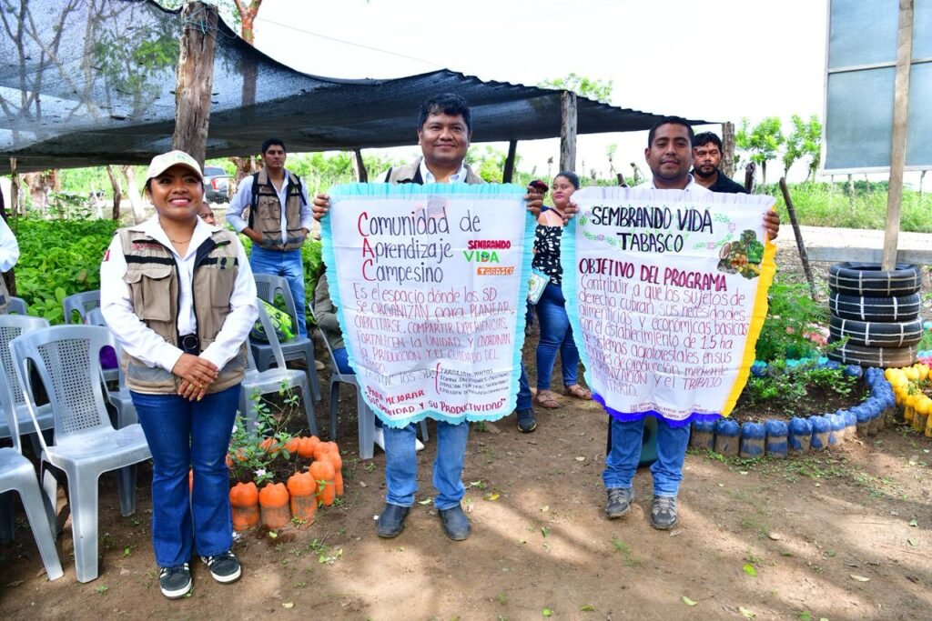 En este vivero, 20 campesinas y campesinos producen más de 5,200 plantas frutales, maderables y ornamentales. El mandatario recordó que el programa beneficia a 72 mil sembradores en todo el estado, combinando esfuerzos federales y estatales. Sembrando Vida busca sembrar 50 mil hectáreas de cacao y reforestar 100 mil hectáreas con 100 millones de árboles. Javier May reafirmó que “la oficina del Gobierno del Pueblo está en el territorio”, reconociendo el trabajo de hombres y mujeres del campo tabasqueño como base de la transformación rural.
