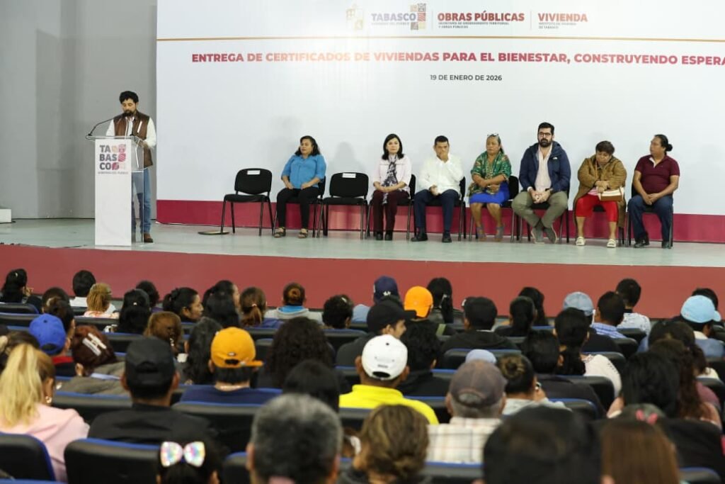 El gobernador Javier May Rodríguez encabezó la entrega de los primeros 100 certificados del programa Viviendas del Bienestar Construyendo Esperanza 2026 en el municipio de Centro, reafirmando que el derecho a la vivienda es prioridad del Gobierno del Pueblo. Informó que estas acciones forman parte de un paquete de mil casas que se edificarán este año y que las primeras estarán listas para ser habitadas a finales de marzo.