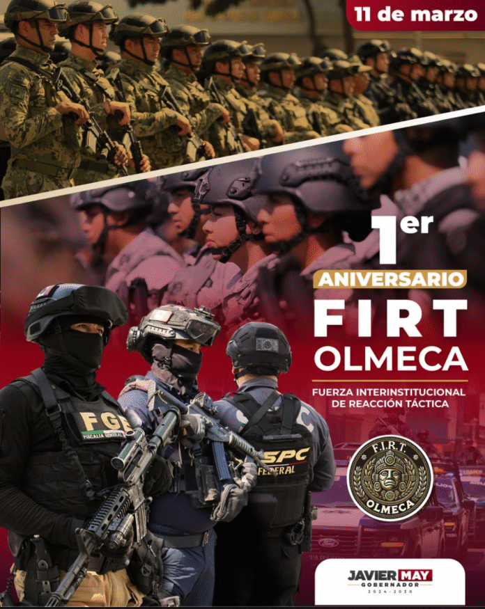 A un año de su creación, la Fuerza Interinstitucional de Reacción Táctica Olmeca (FIRT) ha consolidado su papel como una de las principales estrategias de seguridad en Tabasco, al fortalecer la coordinación entre corporaciones estatales y federales. El gobernador Javier May Rodríguez destacó que durante estos primeros 365 días se han logrado resultados importantes en la protección de las familias tabasqueñas.