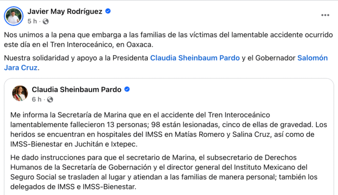 El gobernador de Tabasco, Javier May, expresó su solidaridad con las familias afectadas por el accidente del Tren Interoceánico registrado en el estado de Oaxaca. A través de un mensaje público, el mandatario lamentó el suceso y señaló que su administración se une a la pena que embarga a los familiares de las víctimas, además de manifestar su respaldo a la presidenta Claudia Sheinbaum y al gobernador de Oaxaca, Salomón Jara.