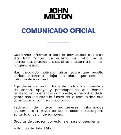 El hipnotista John Milton, conocido como “el caballero de la hipnosis”, sufrió un asalto violento mientras conducía por la carretera Culiacán–Eldorado el martes 2 de septiembre. Cuatro hombres armados lo detuvieron, lo amenazaron y le robaron su camioneta y pertenencias, aunque Milton aclaró que no resultó herido. La Fiscalía General del Estado de Sinaloa recibió la denuncia y comenzó la búsqueda de los responsables; la camioneta fue localizada parcialmente. Milton solicitó públicamente la devolución de documentos importantes, incluido pasaporte y visa, pues tenía previsto un viaje familiar. Con más de 30 años de trayectoria en hipnosis artística y clínica, Milton continúa su gira en Sinaloa, defendiendo la importancia de la cultura y el entretenimiento, incluso frente a la inseguridad. Su legado combina espectáculos, terapia y capacitación profesional en hipnosis.