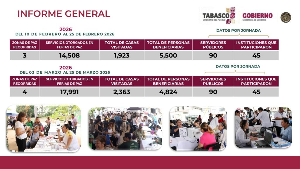 El Gobierno de Tabasco informó que las Jornadas de Paz y Escuelas de Paz han beneficiado a más de 11 mil ciudadanos durante el primer trimestre de 2026, como parte de una estrategia integral para generar entornos seguros y fortalecer el bienestar social.