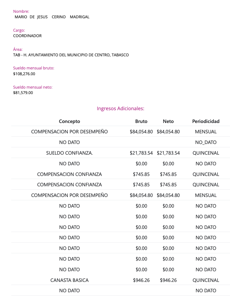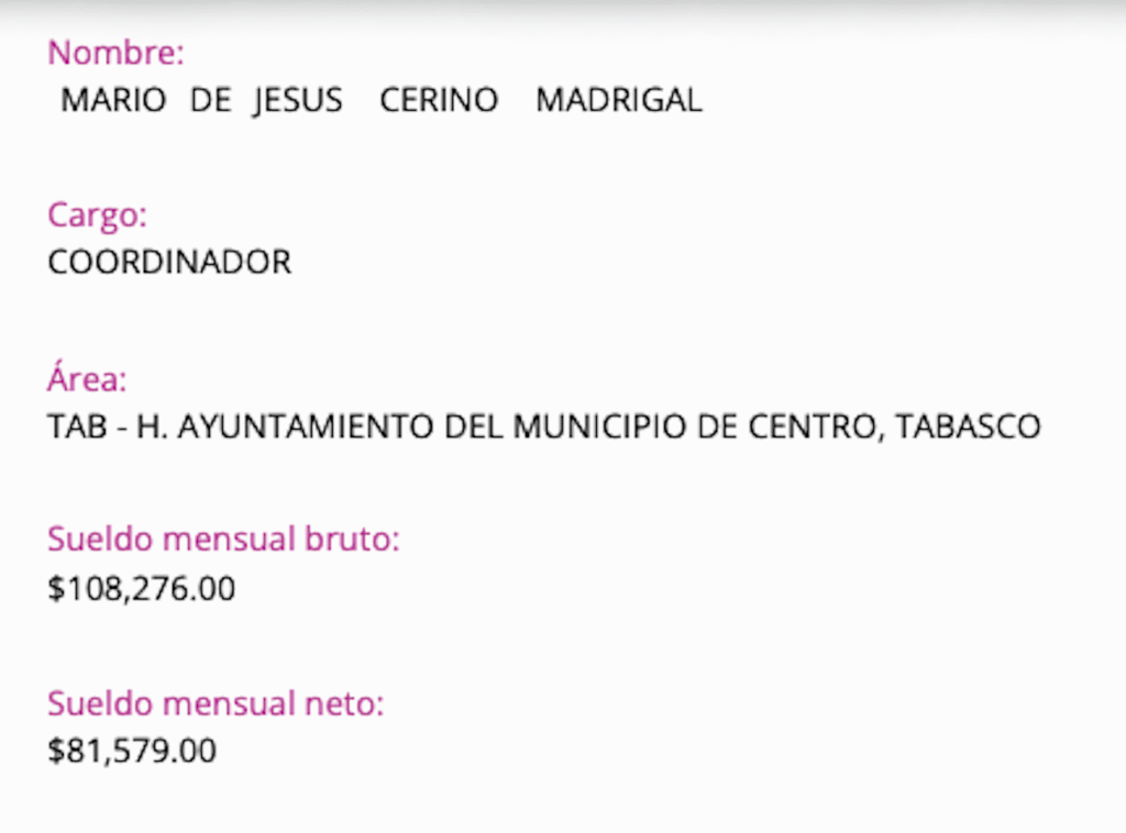 En el Ayuntamiento de Centro, Mario Cerino Madrigal aparece desde el año 2022 como coordinador, según los registros del portal de transparencia municipal. Actualmente cobra ahí un sueldo mensual bruto de $108,276.00 y un sueldo mensual neto de $81,579.00. Esta cifra por sí sola lo coloca entre los funcionarios mejor pagados del municipio, con un salario superior al de muchos titulares de áreas estratégicas.