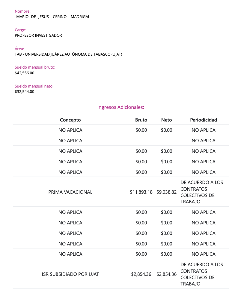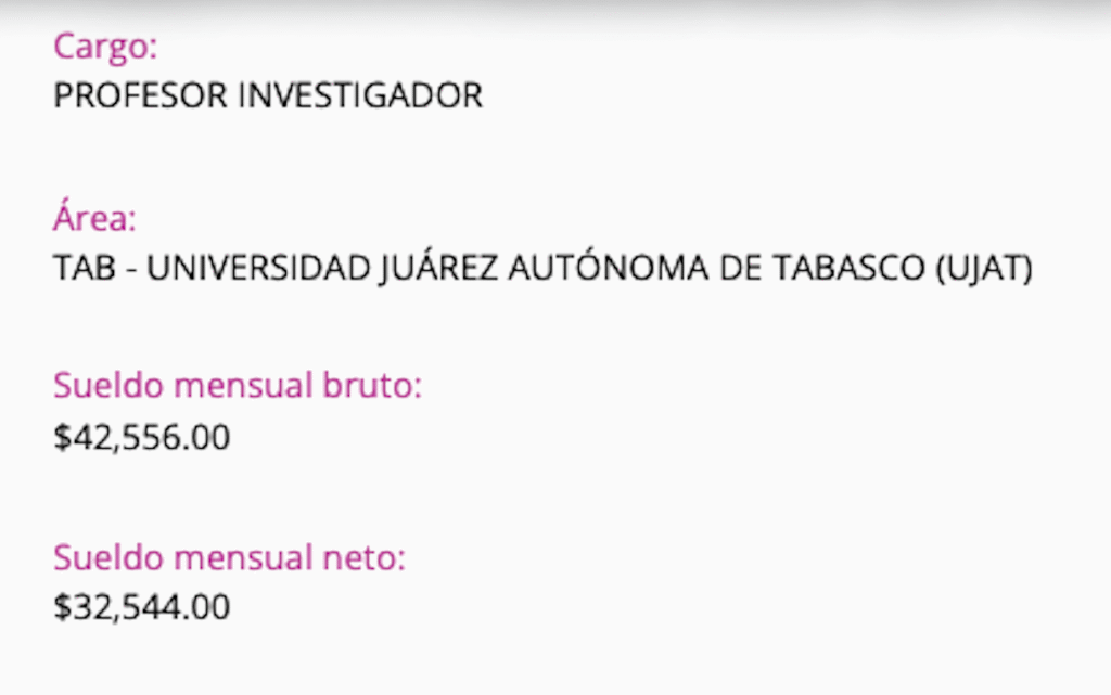 Pero al revisar el portal de transparencia de la Universidad Juárez Autónoma de Tabasco (UJAT), la sorpresa fue mayor. Cerino Madrigal aparece desde 2021 como Profesor Investigador de Tiempo Completo, con un sueldo mensual bruto de $42,556.00 y un sueldo mensual neto de $32,544.00. Esta plaza, por su naturaleza académica, también exige dedicación completa, asistencia a clases, labores de investigación, tutorías, participación en cuerpos académicos y cumplimiento de actividades institucionales que no pueden ser sustituidas por terceros.