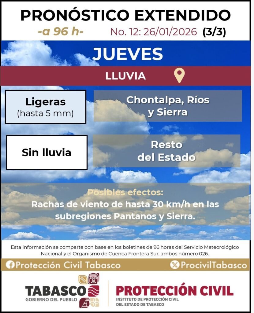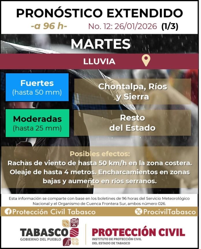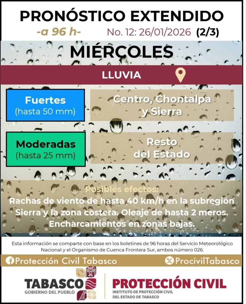 Además, persistirá el evento de Norte, con rachas de viento de hasta 50 km/h y oleaje de hasta cuatro metros en la costa. El miércoles continuarán las precipitaciones, concentradas en Centro, Chontalpa y Sierra, y el jueves se esperan lluvias ligeras y periodos sin precipitación. Protección Civil advirtió riesgo de encharcamientos, vados carreteros y aumentos súbitos en ríos serranos, especialmente durante la noche y madrugada. Se exhorta a la población a extremar precauciones, evitar cruzar ríos crecidos, atender deslaves en caminos rurales y mantenerse informada por canales oficiales.