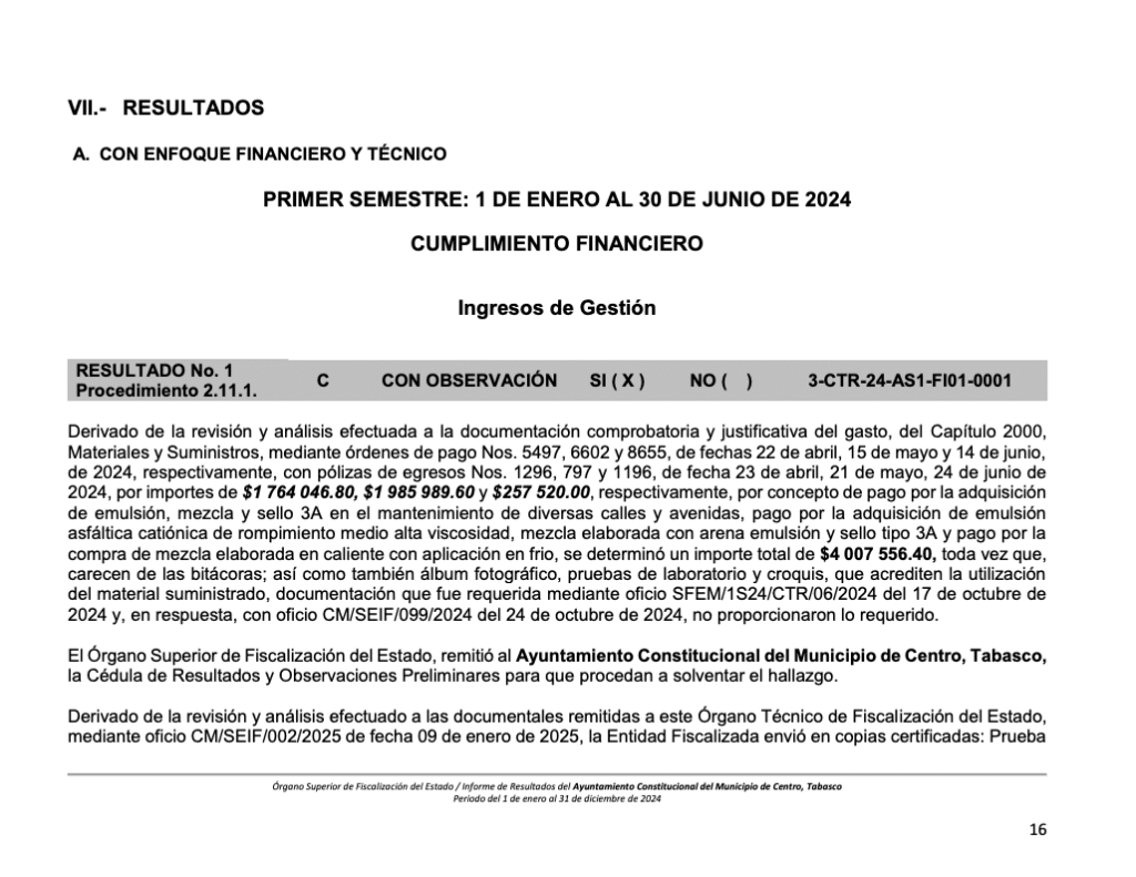 El OSFE señala que durante 2024 se realizaron diversos pagos por más de 4 millones de pesos relacionados con la compra de emulsión, mezcla y sello 3A para el mantenimiento de calles y avenidas. Sin embargo, los expedientes carecen de bitácoras, croquis, álbumes fotográficos y pruebas de laboratorio que acrediten el uso real de los materiales adquiridos.