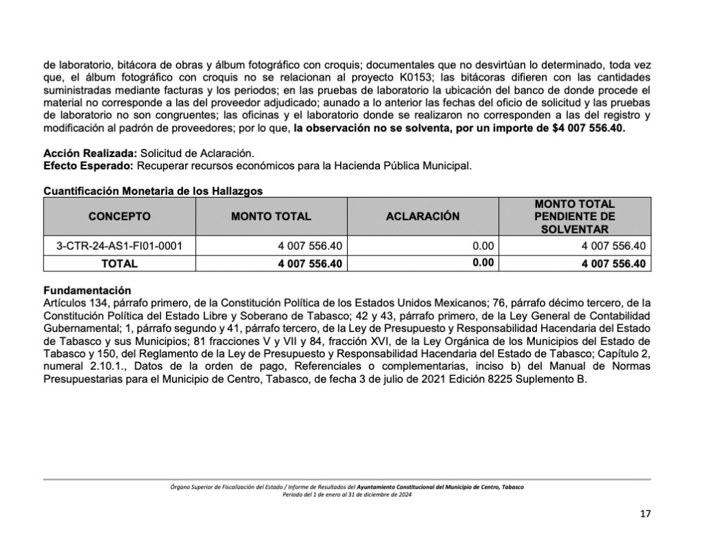 En este último caso, por 2 millones 560 mil pesos, se determinó que los gastos por restauración del entorno urbano no estaban autorizados dentro del convenio de colaboración entre la Secretaría de Hacienda y el Ayuntamiento. Además, las facturas carecen de detalle unitario de materiales y mano de obra, lo que impide verificar su autenticidad.