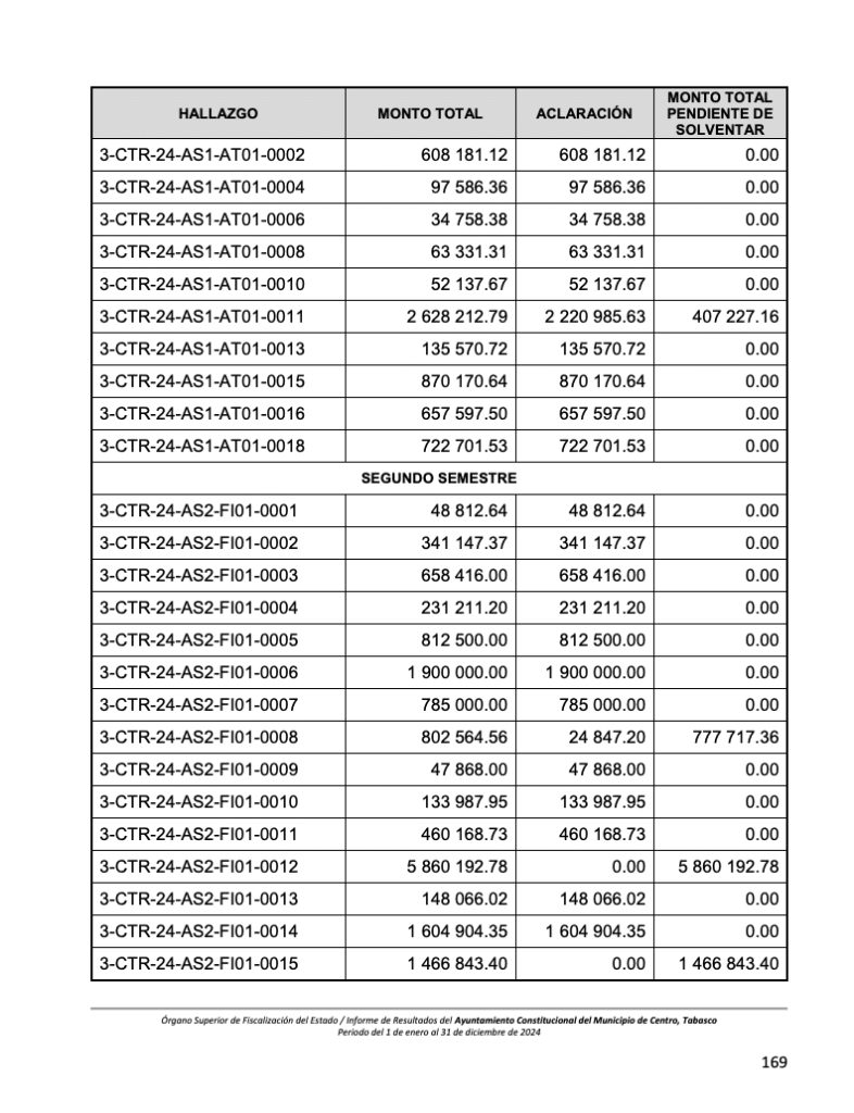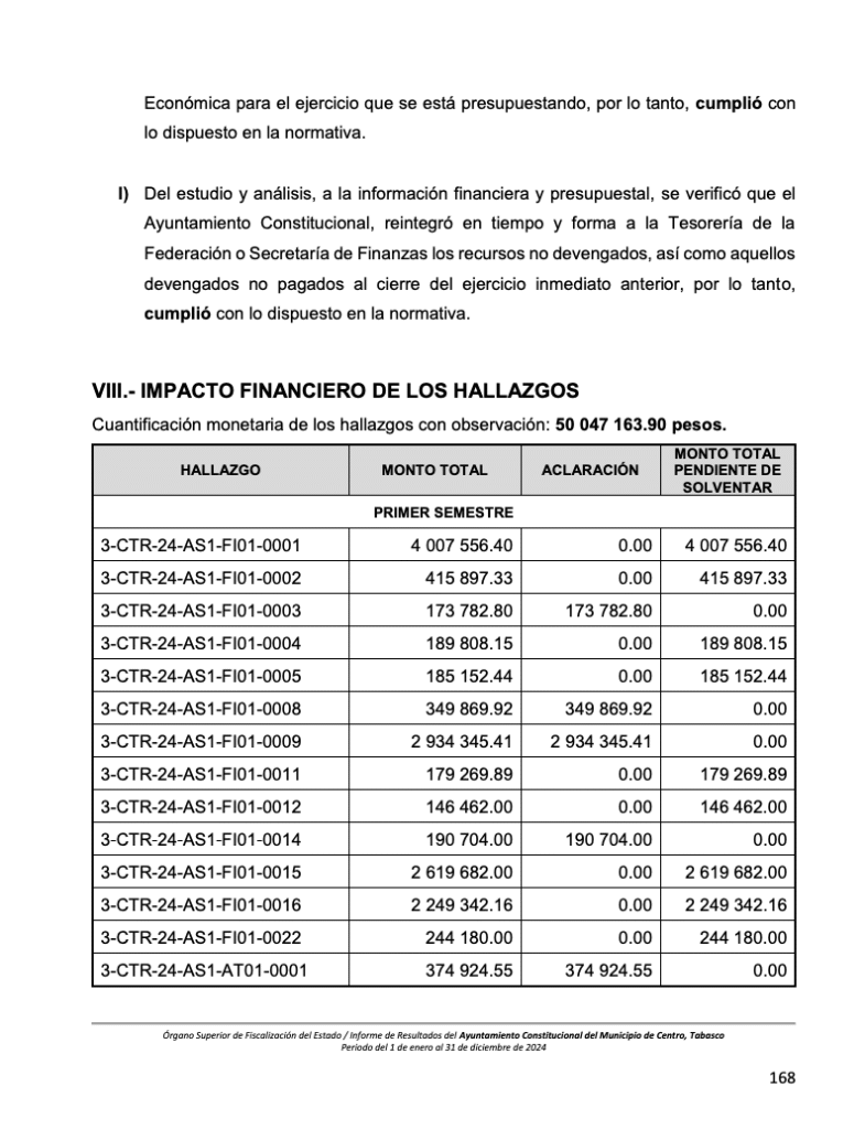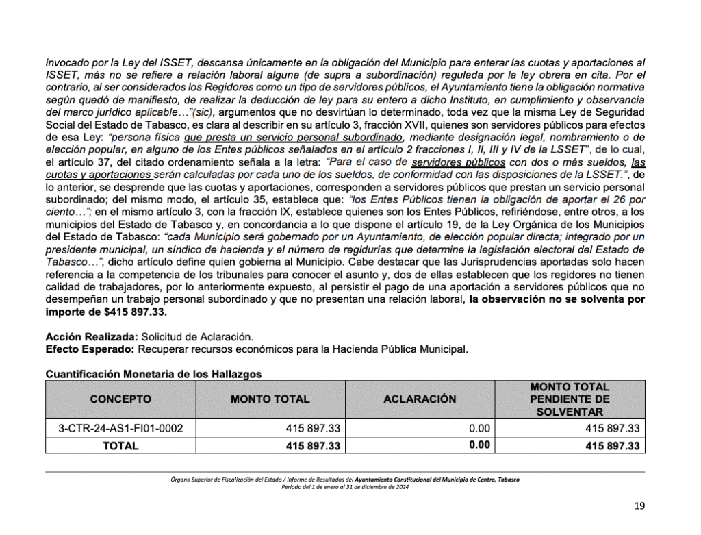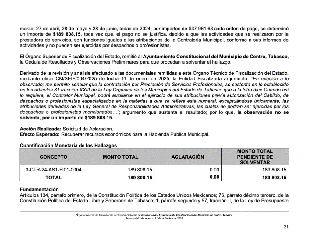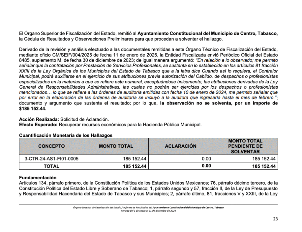 El informe también documenta pagos indebidos por 374 mil 960 pesos en asesorías contratadas para la operación de programas de la Contraloría Municipal. Según el OSFE, las actividades realizadas por los despachos externos duplican funciones propias del personal del Ayuntamiento, lo que contraviene la Ley Orgánica de los Municipios del Estado de Tabasco.