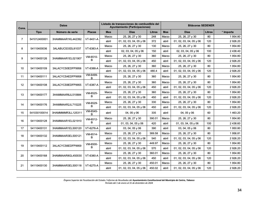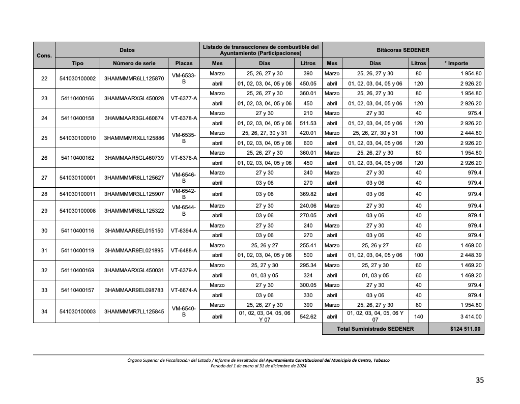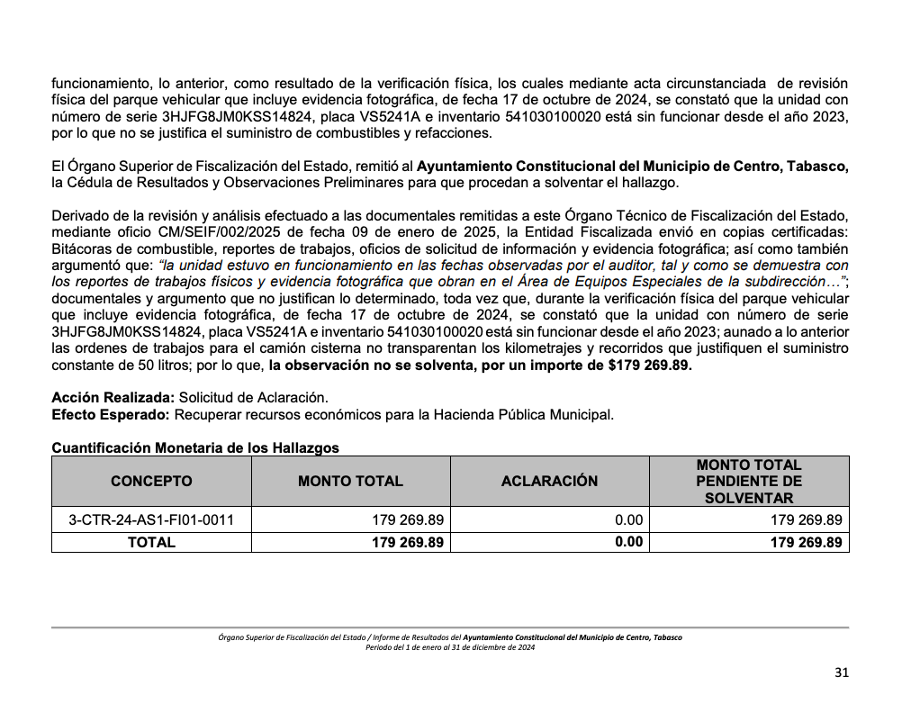 De acuerdo con la verificación física del parque vehicular, una unidad marca International con número de serie 3HJFG8JM0KSS14824 se encuentra fuera de operación desde 2023, pero durante 2024 recibió combustible y refacciones.