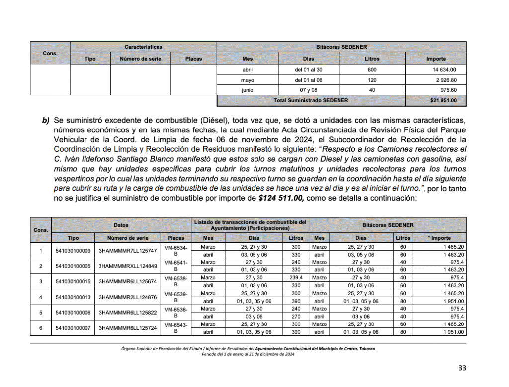 Una de las observaciones más llamativas se relaciona con el suministro de combustible y refacciones a vehículos sin funcionamiento, lo que representó un daño por más de 325 mil pesos.