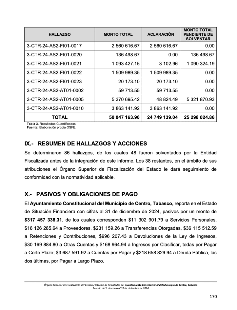 Villahermosa, Tabasco.— El Órgano Superior de Fiscalización del Estado (OSFE) reveló en su informe de resultados del ejercicio 2024 una serie de irregularidades financieras y administrativas en el Ayuntamiento de Centro que, en conjunto, representan un daño económico estimado en 25 millones 298 mil pesos. Las observaciones apuntan a pagos sin justificación documental, contratos irregulares, adquisiciones sin comprobación de uso y servicios inexistentes, todos bajo la administración de la alcaldesa Yolanda Osuna Huerta.