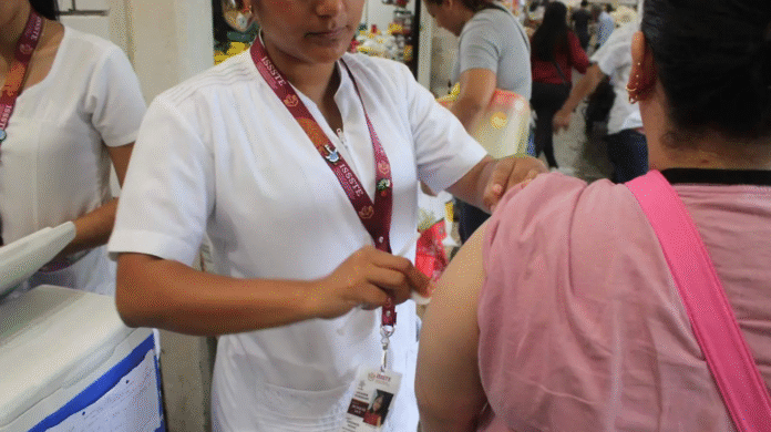 Señotas de casa que acudieron al mercado José María Pino Suárez, en Villahermosa, aprovecharon la instalación de un módulo de la Secretaría de Salud para aplicarse gratuitamente la vacuna contra el sarampión. La jornada registró una alta participación de mujeres, quienes destacaron la importancia de la prevención ante el resurgimiento de la enfermedad en Tabasco.